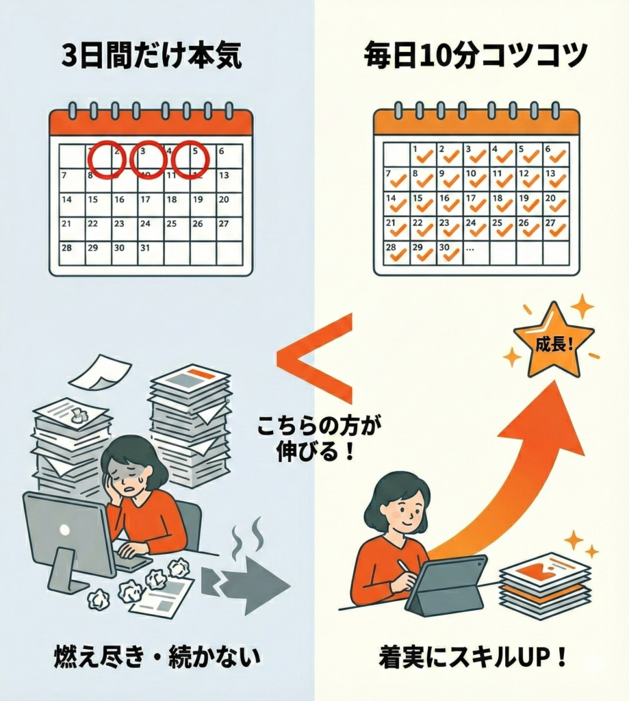 3日間本気でやる人より、10分でも毎日触る人の方が伸びます。