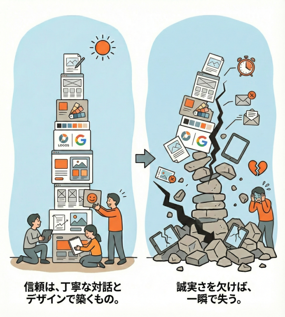 どれだけデザインが上手くても、誠実さを欠いた対応をすれば、評価は簡単に崩れます。